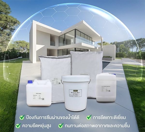 - GEL Waterproof Type Flexi: ซีเมนต์ทากันซึมสองส่วนผสม ชนิดยืดหยุ่นสูง ถูกออกแบบมาเป็นพิเศษเพื่อรองรับการขยับตัวของรอยต่อบริเวณระเบียง ป้องกันไม่ให้ระบบกันซึมฉีกขาดตามรอยร้าวของคอนกรีต