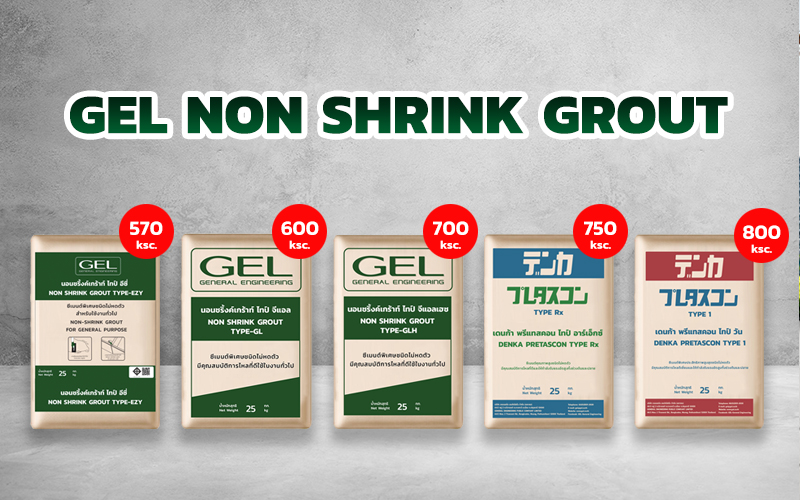 - GEL Non-Shrink Grout Type GL : ค่ากำลังรับแรงอัดมากกว่า 600 ksc(cu) ที่ 28 วัน